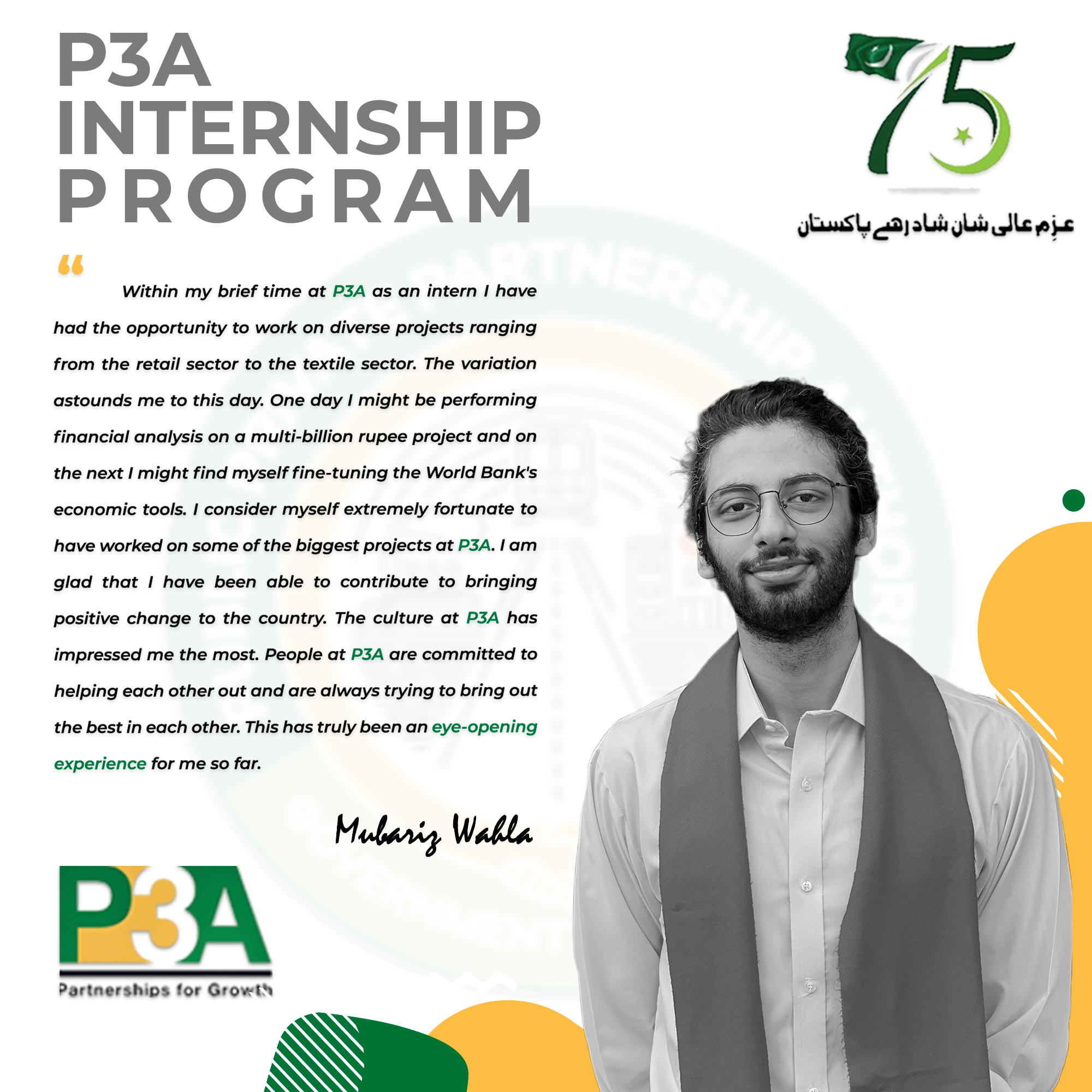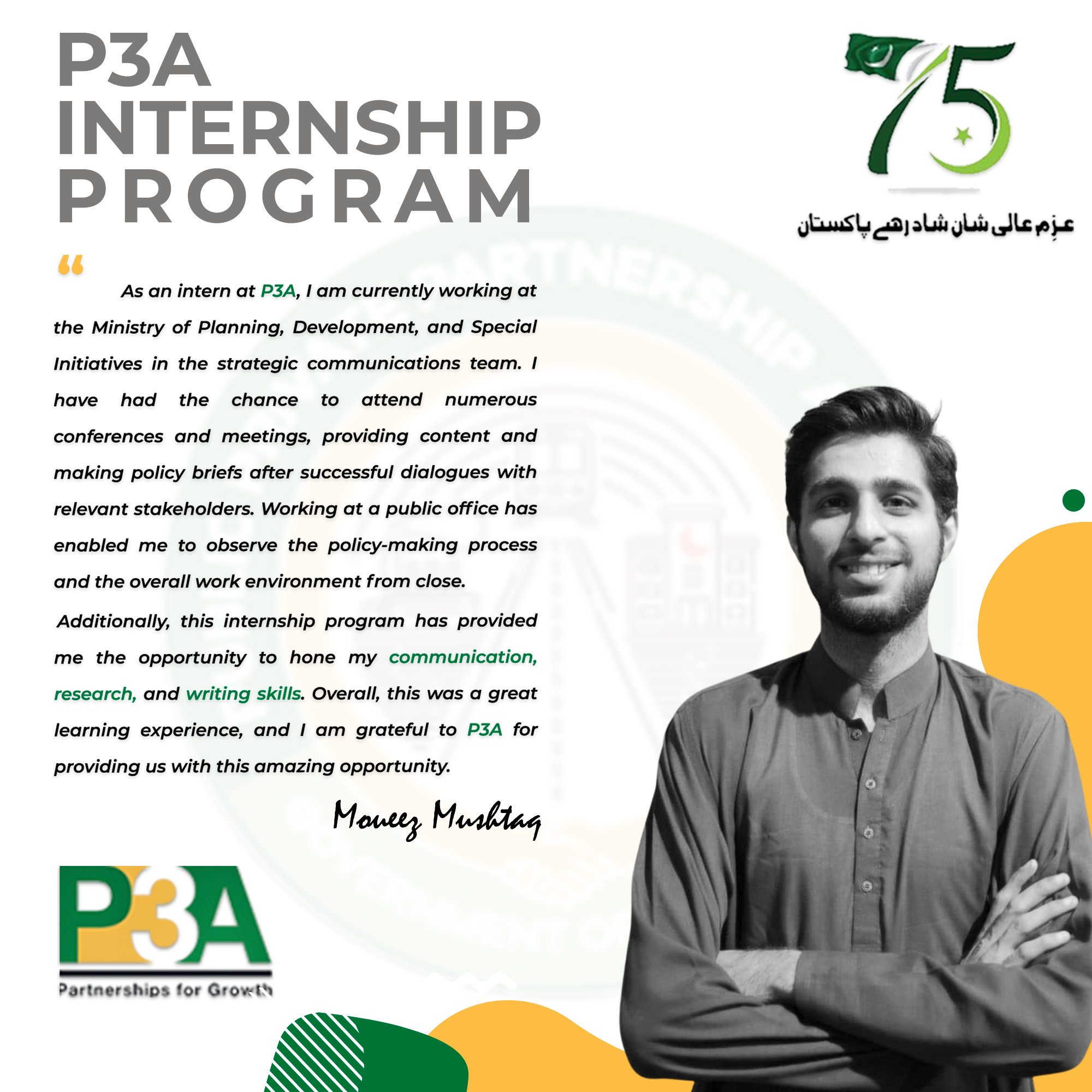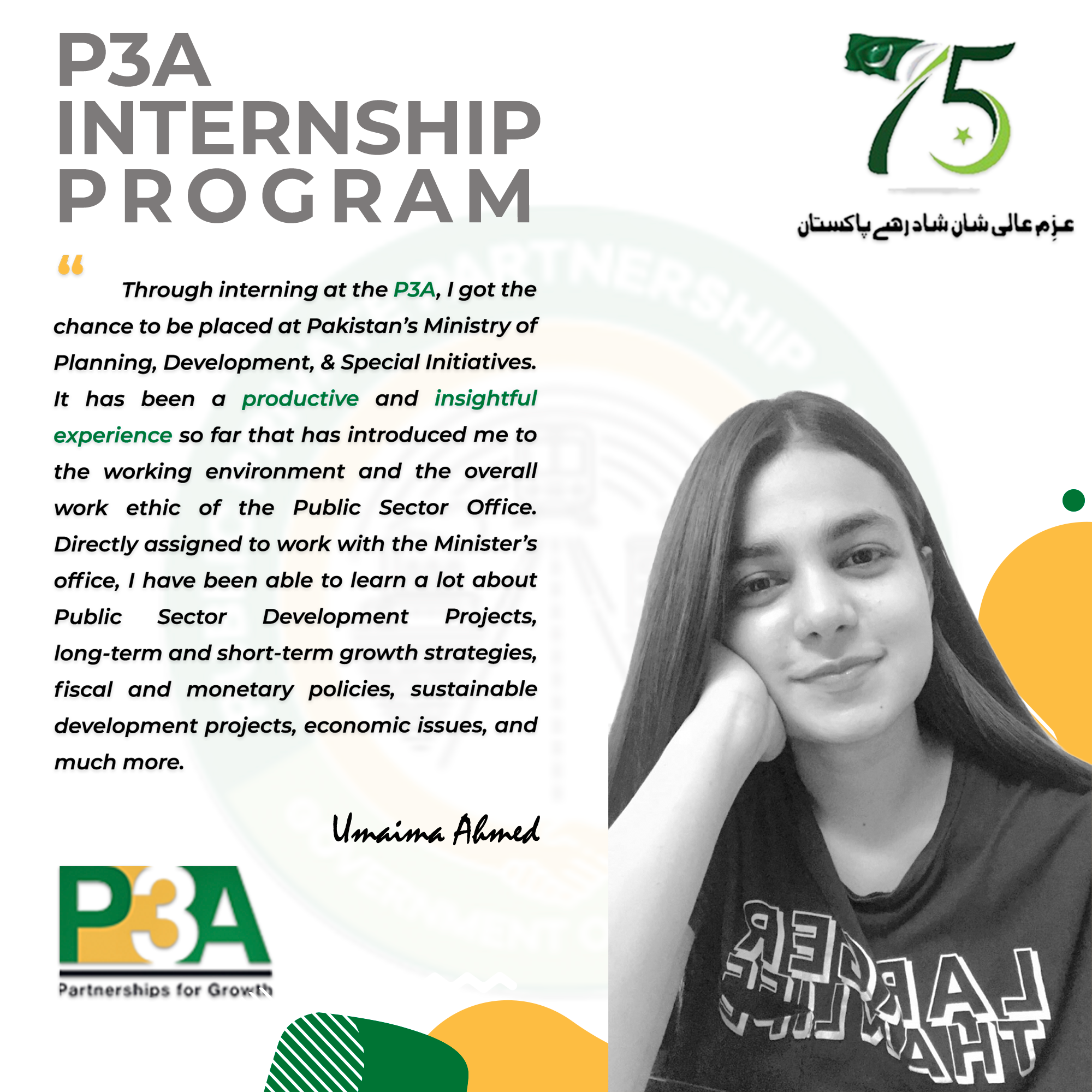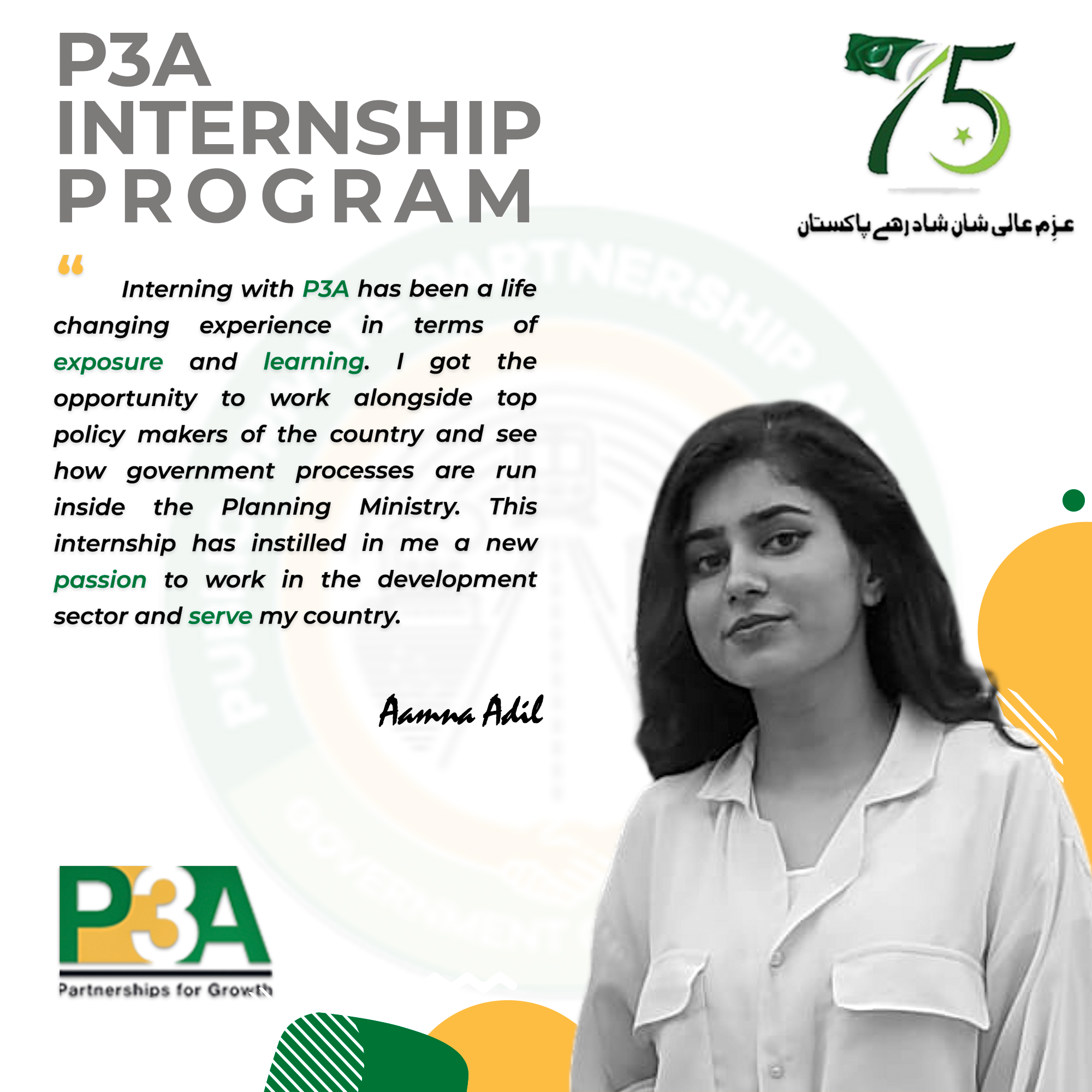 At this occasion, the Federal Minister distributed internship completion certificates to the interns and said such type of programs should be launched by the public sector entities on recurring basis in order to enable youth to gain practical experience of working in the public sector and contribute towards country's development.The Minister commended P3A's initiative of engaging with alumni of world class universities.