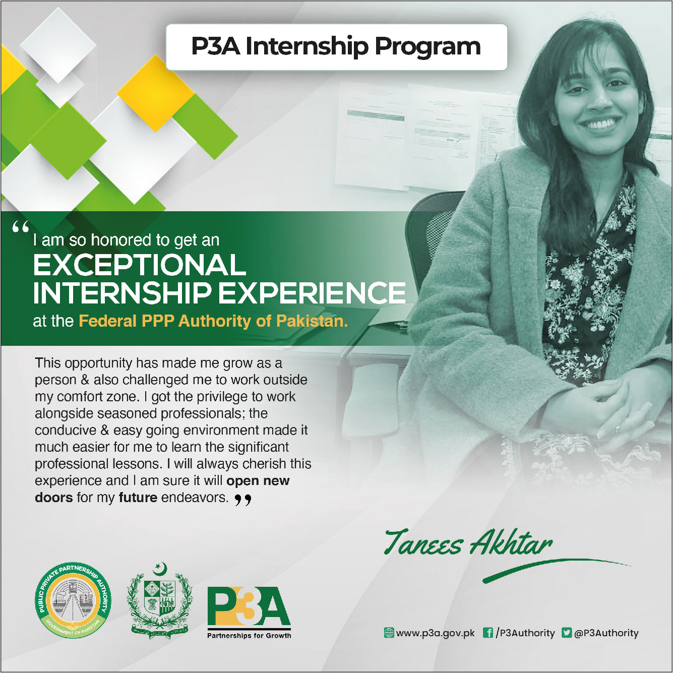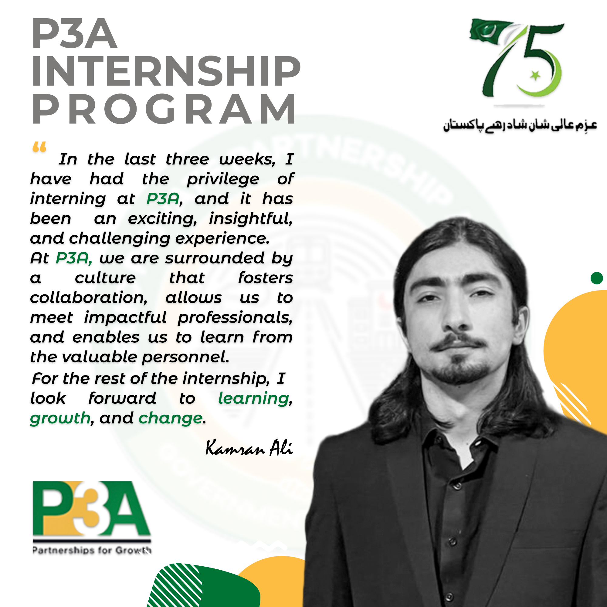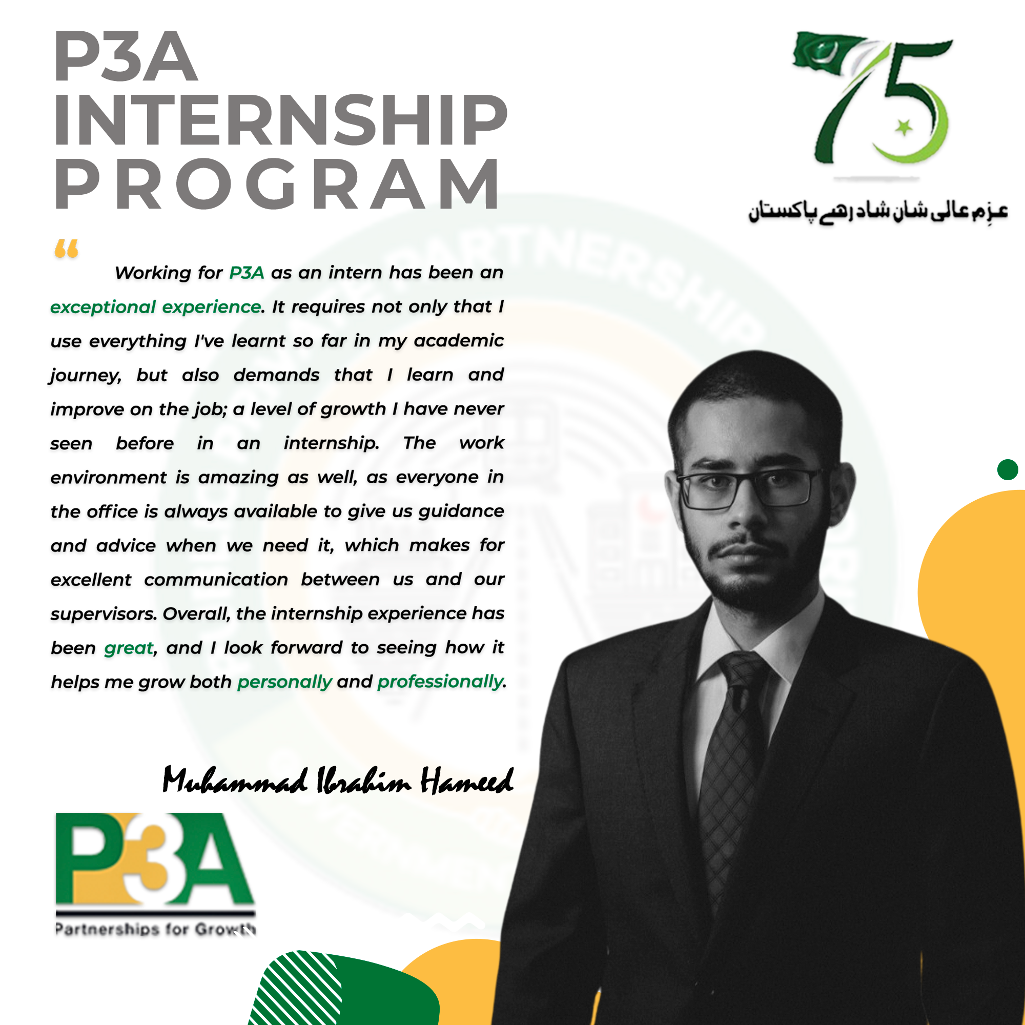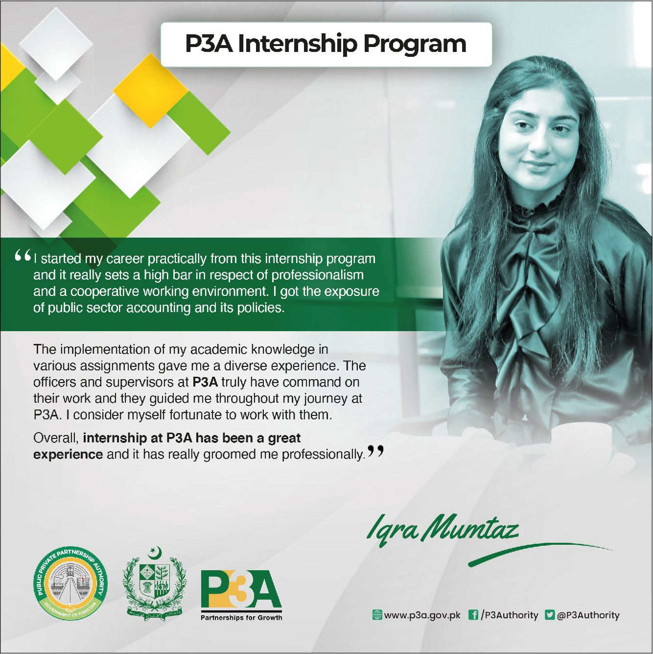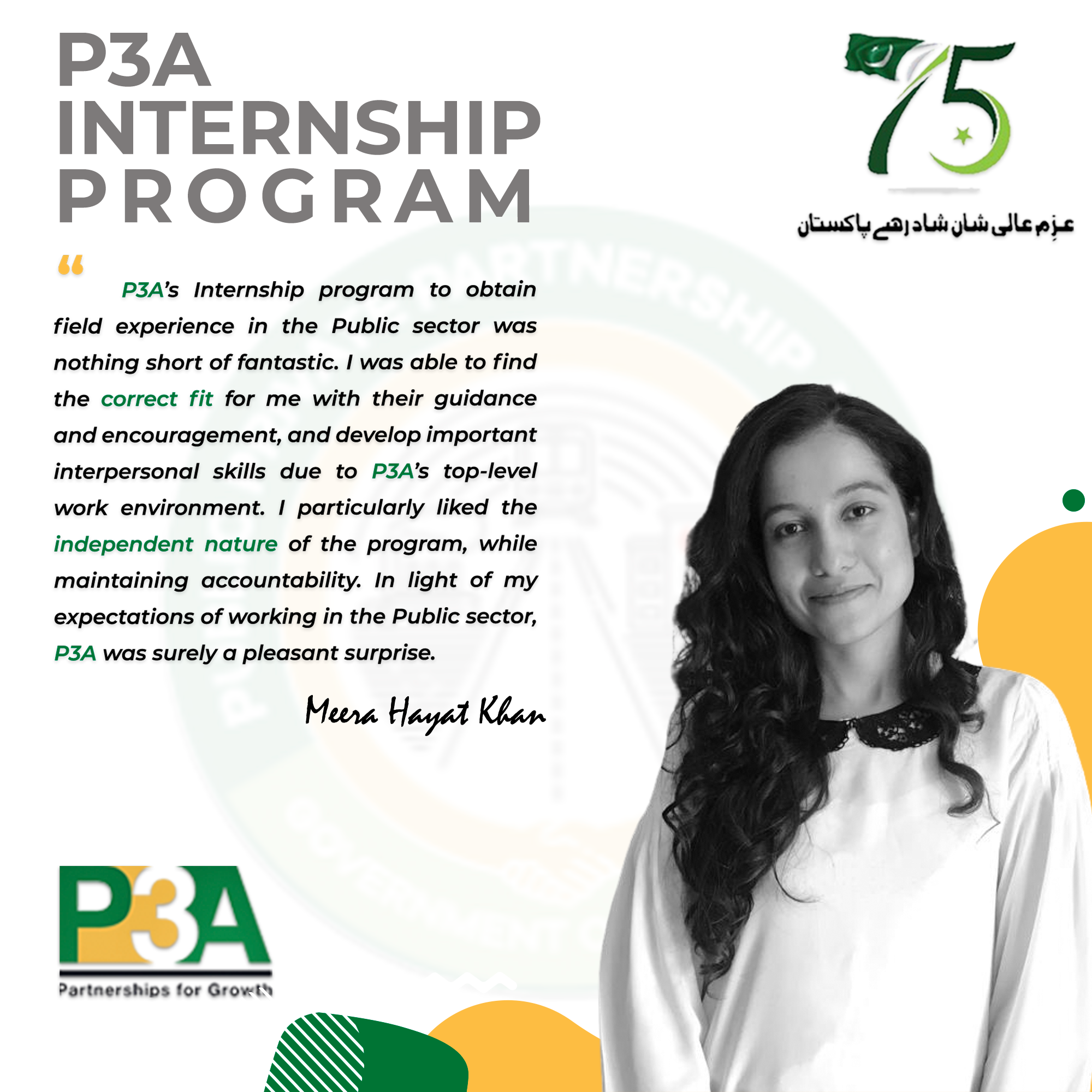 At this occasion, the Federal Minister distributed internship completion certificates to the interns and said such type of programs should be launched by the public sector entities on recurring basis in order to enable youth to gain practical experience of working in the public sector and contribute towards country's development.The Minister commended P3A's initiative of engaging with alumni of world class universities.