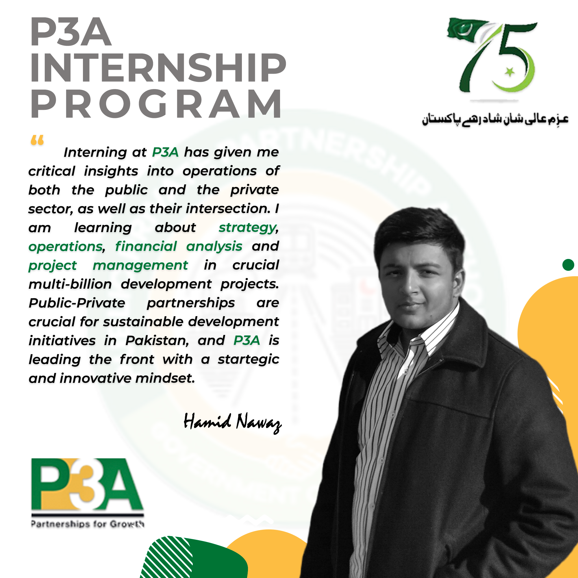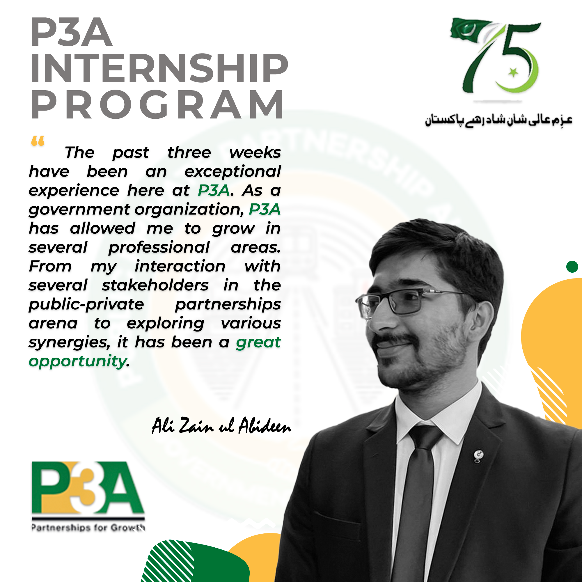 Graduation ceremony for the first cohort of interns was graced by the Federal Minister for Planning, Development & Special Initiatives; Mr.Ahsan Iqbal Chaudhary. The internship program spearheaded by the P3A provided program participants unique experience of working with a prestigious public sector organization that acts as a bridge between government and private sector players in order to attract investment in infrastructure.